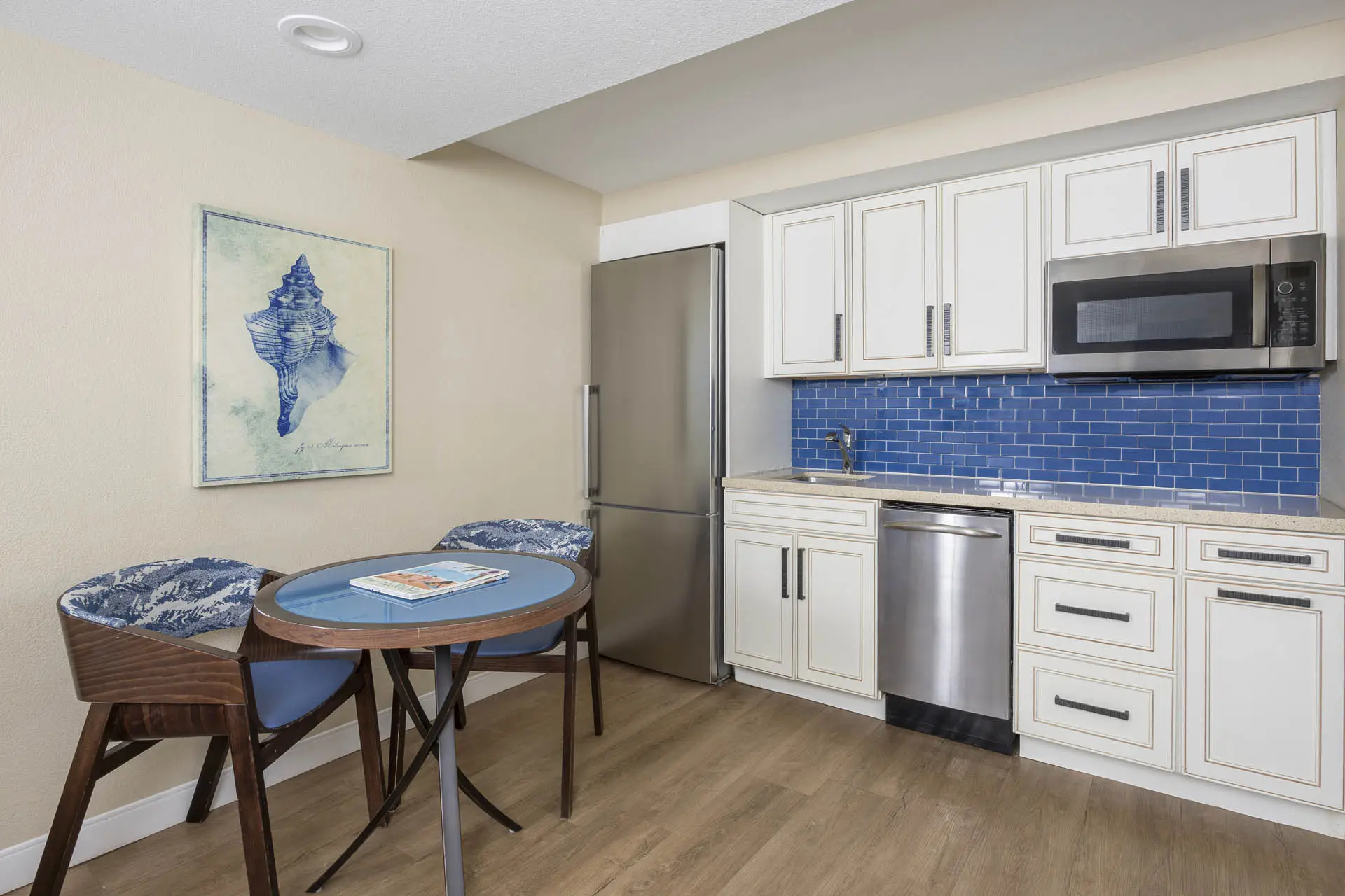 - Kitchenette equipped with a full-sized refrigerator, dishwasher, toaster, flatware, and seating for four (a cooktop is not included in this room type)