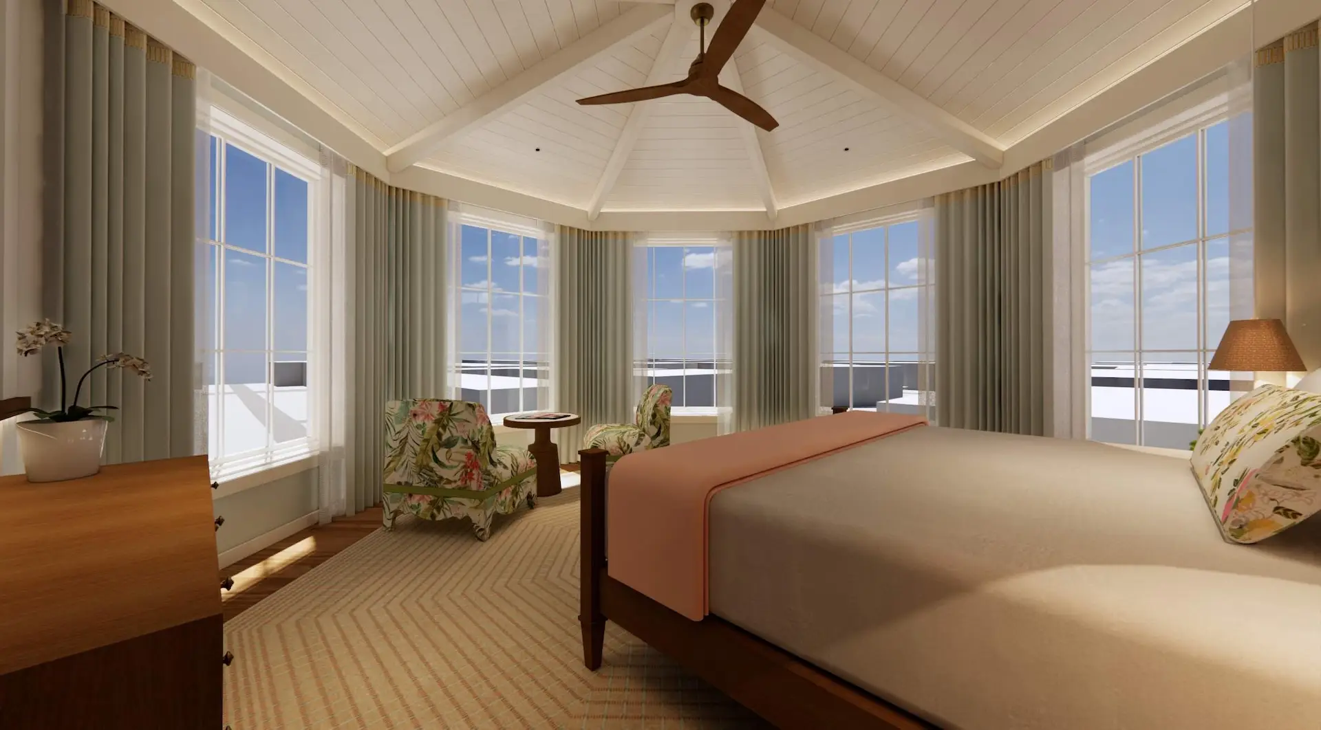 - Three king bedrooms, including one unique octagonal-shaped option featuring vaulted ceilings and multiple windows overlooking Third Street