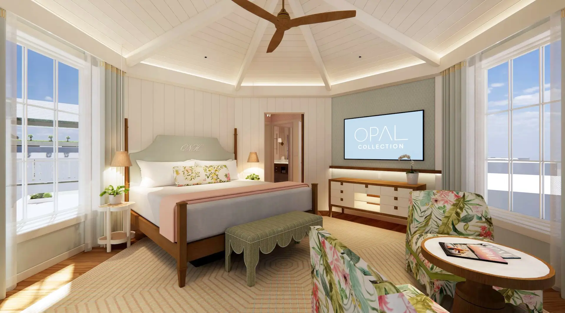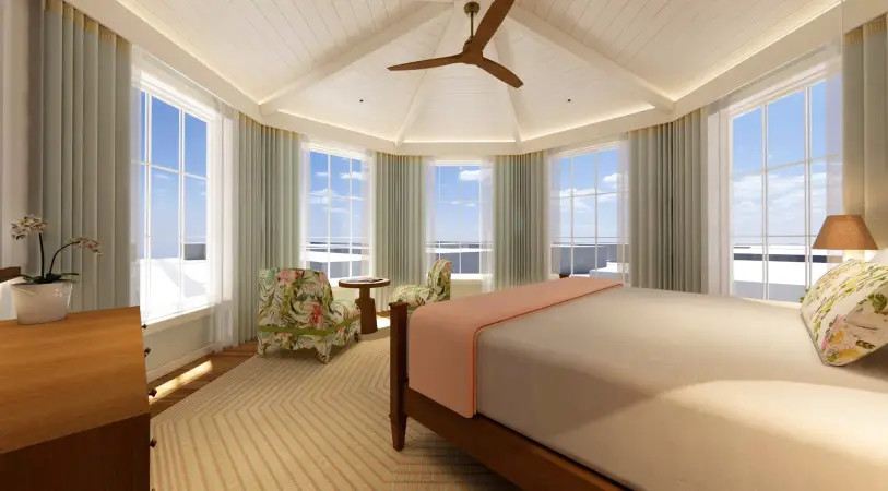 - Three king bedrooms, including one unique octagonal-shaped option featuring vaulted ceilings and multiple windows overlooking Third Street
