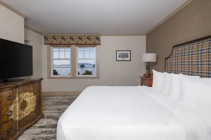 Accessible Lake View Rooms at the Main Hotel feature a luxe king bed, Adirondack-inspired decor, and breathtaking views of Lake George. Thoughtful amenities like high-speed Internet and marble-accented bathrooms add extra comfort to every stay. Images depict a variety of layout and décor options for this room type and cannot be guaranteed.