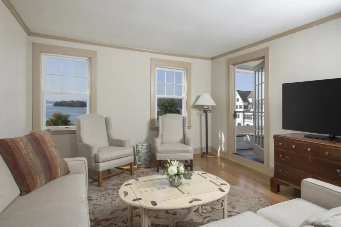 The Accessible Lake View Governor's Room at the Main Hotel features breathtaking views of Lake George. Enjoy contemporary Adirondack-inspired decor and thoughtful amenities like high-speed Internet and marble-accented bathrooms. Images depict a variety of layout and décor options for this room type and cannot be guaranteed.