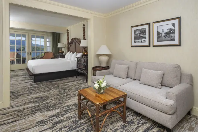 Accessible Lake View One-Bedroom Suites at the Main Hotel include a separate bedroom featuring a plush king bed with luxe linens, a living area with a queen-sized sleeper sofa, and breathtaking views of Lake George. Adirondack-inspired decor, high-speed Internet, and marble-accented bathrooms add extra comfort to every stay. Images depict a variety of layout and décor options for this room type and cannot be guaranteed.